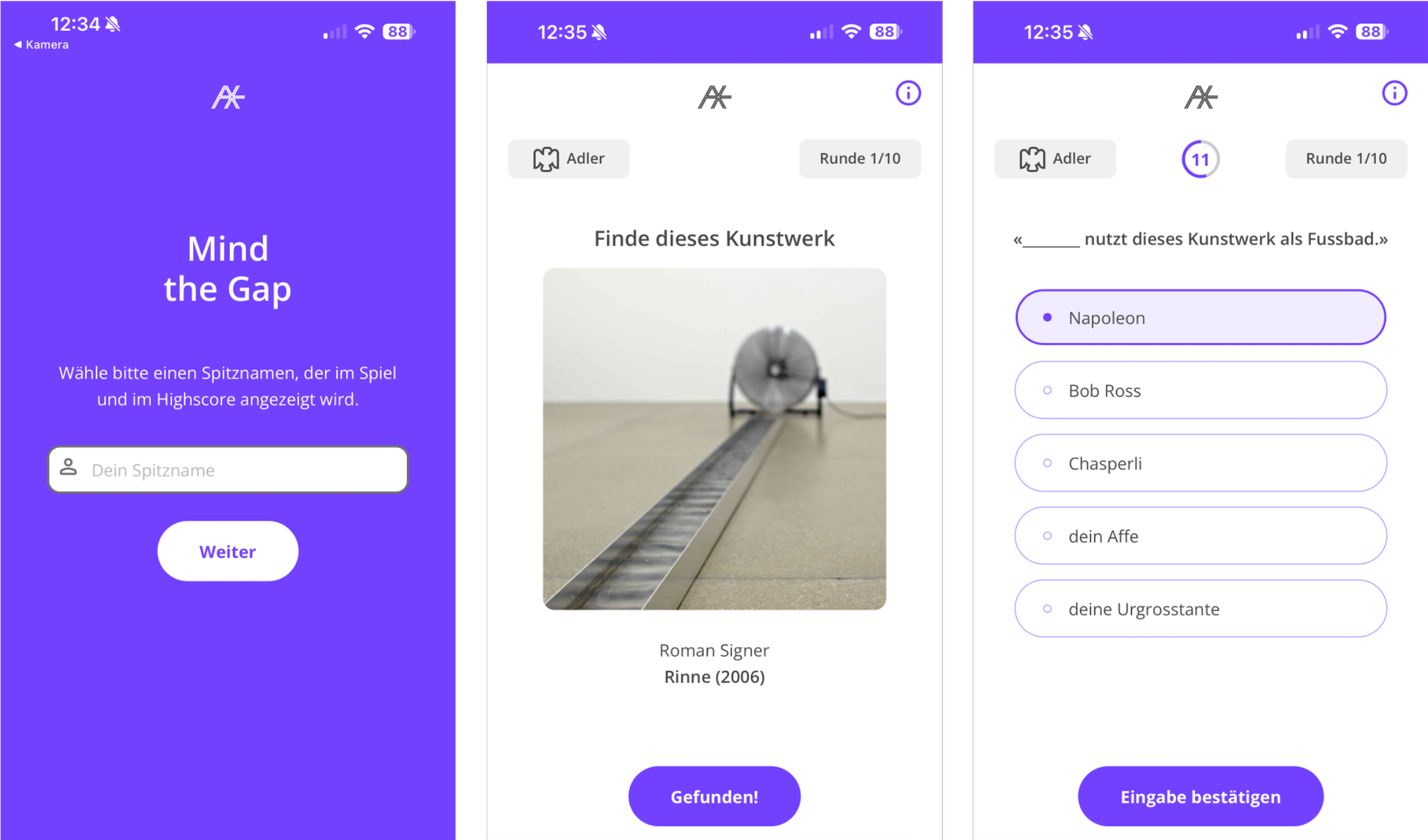 Inspired by the popular card game "Cards Against Humanity" or "Der Wahre Walter", the digital game "Mind the Gap" dares players to make silly, creative, and snarky observations about art. Players form teams and complete humorous fill-in-the-blank statements about pieces in the gallery. They’re encouraged to look closely at art and move around the museum to discover the collection. The person with the best quip wins!